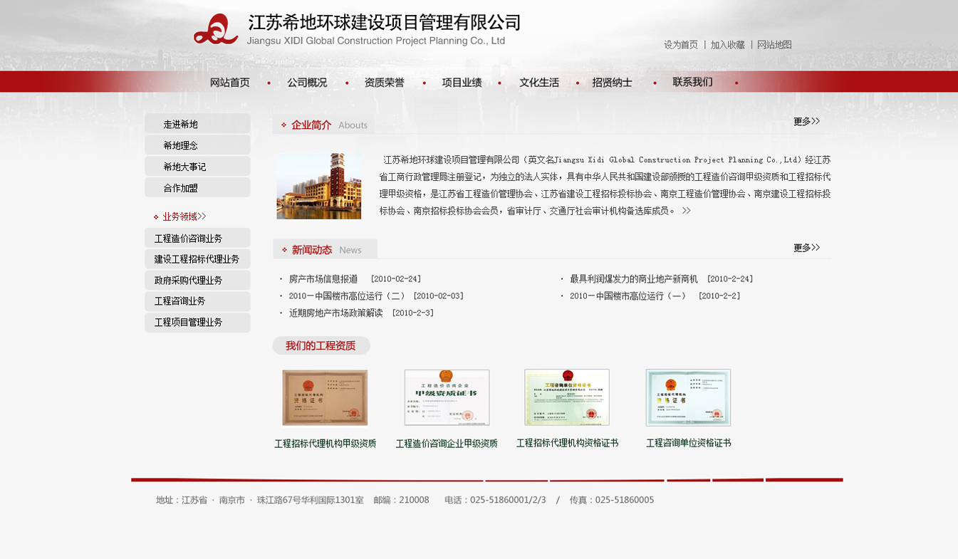 江蘇希地環(huán)球建設(shè)項目管理有限公司(英文名Jiangsu Xidi Global Construction Project Planning Co.,Ltd)經(jīng)江蘇省工商行政管理局注冊登記,為獨立的法人實體,具有中華人民共和國建設(shè)部頒授的工程造價咨詢甲級資質(zhì)和工程招標代理甲級資格,是江蘇省工程造價管理協(xié)會、江蘇省建設(shè)工程招標投標協(xié)會、南京工程造價管理協(xié)會、南京建設(shè)工程招標投標協(xié)會、南京招標投標協(xié)會會員,省審計廳、交通廳社會審計機構(gòu)備選庫成員。公司主營工程項目管理、招標代理、造價審計、投資策劃、銷售代理、司法鑒定等咨詢服務(wù)業(yè)務(wù)。
